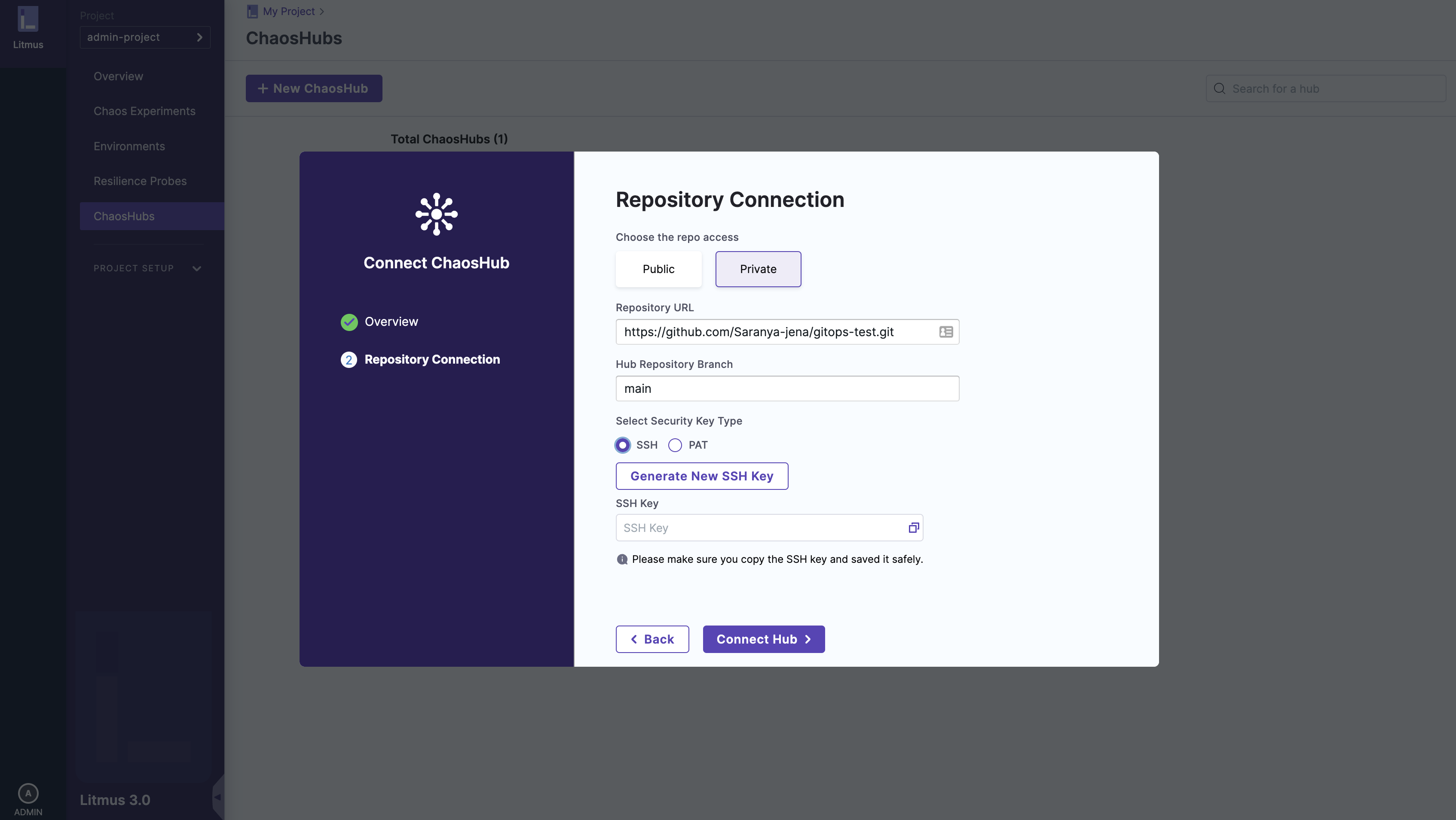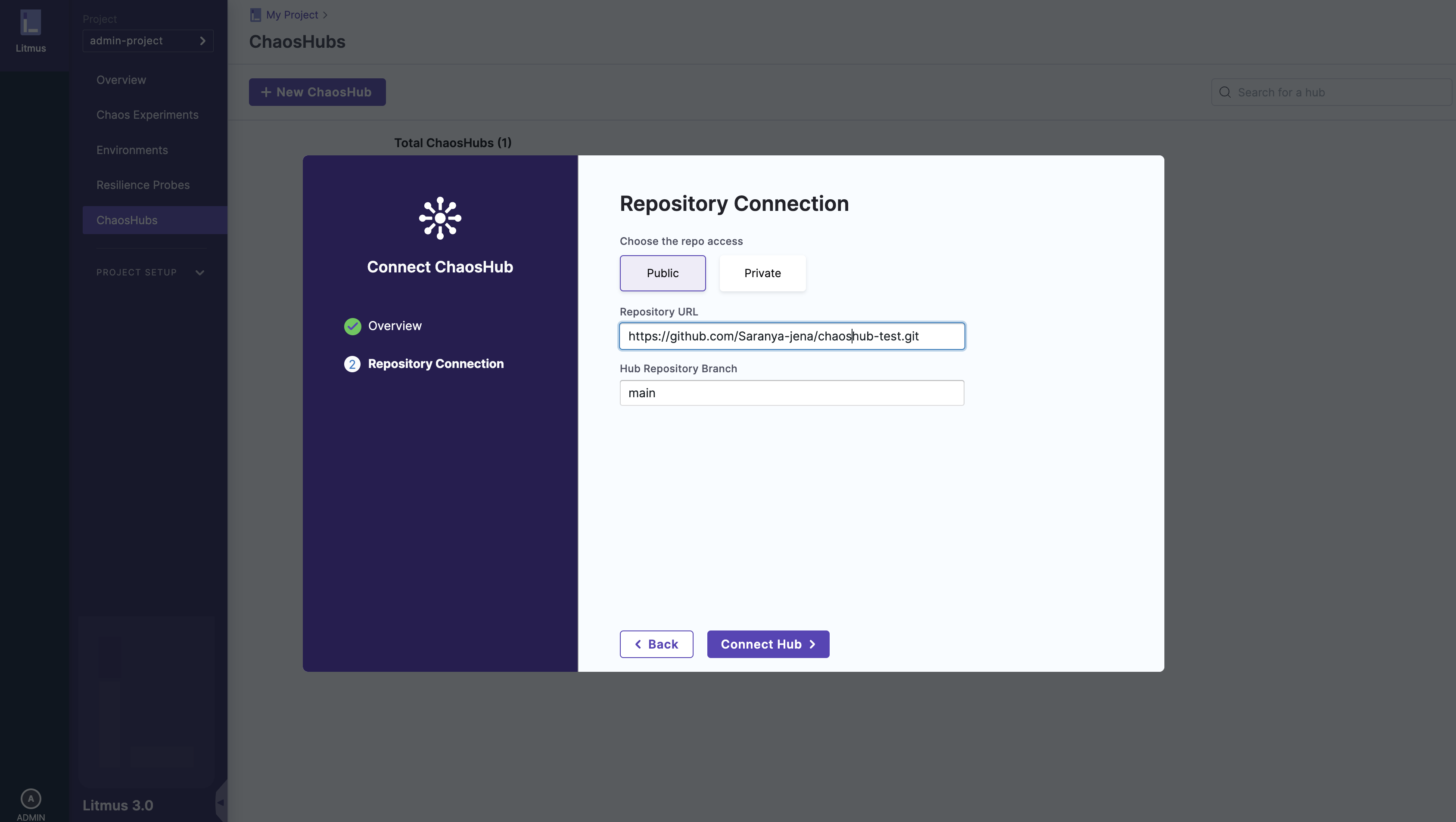 To add a private ChaosHub, you need provide the hub name, Git URL of the forked repository and the branch name similar to that of public hub and the repository can be connected in two ways: