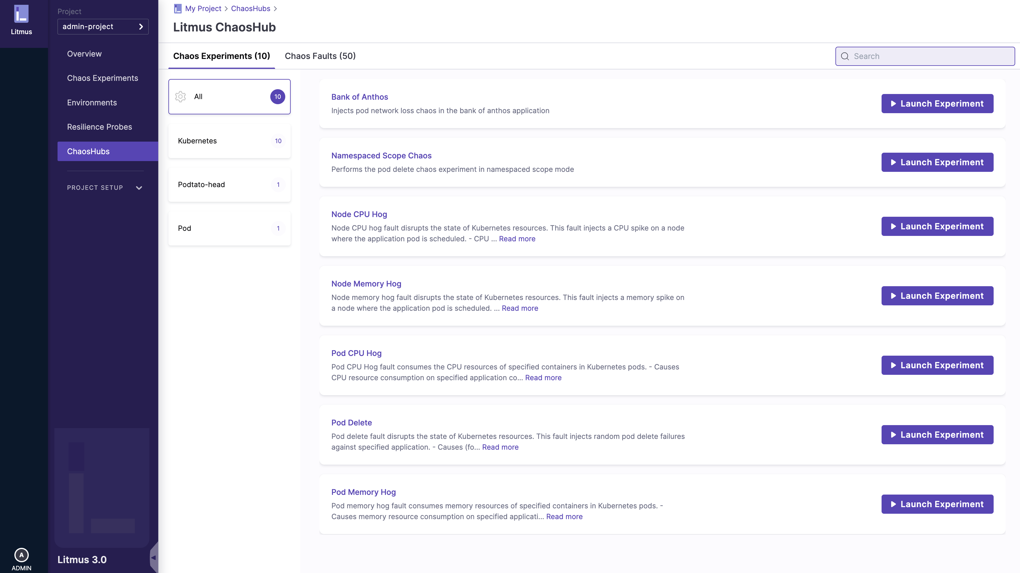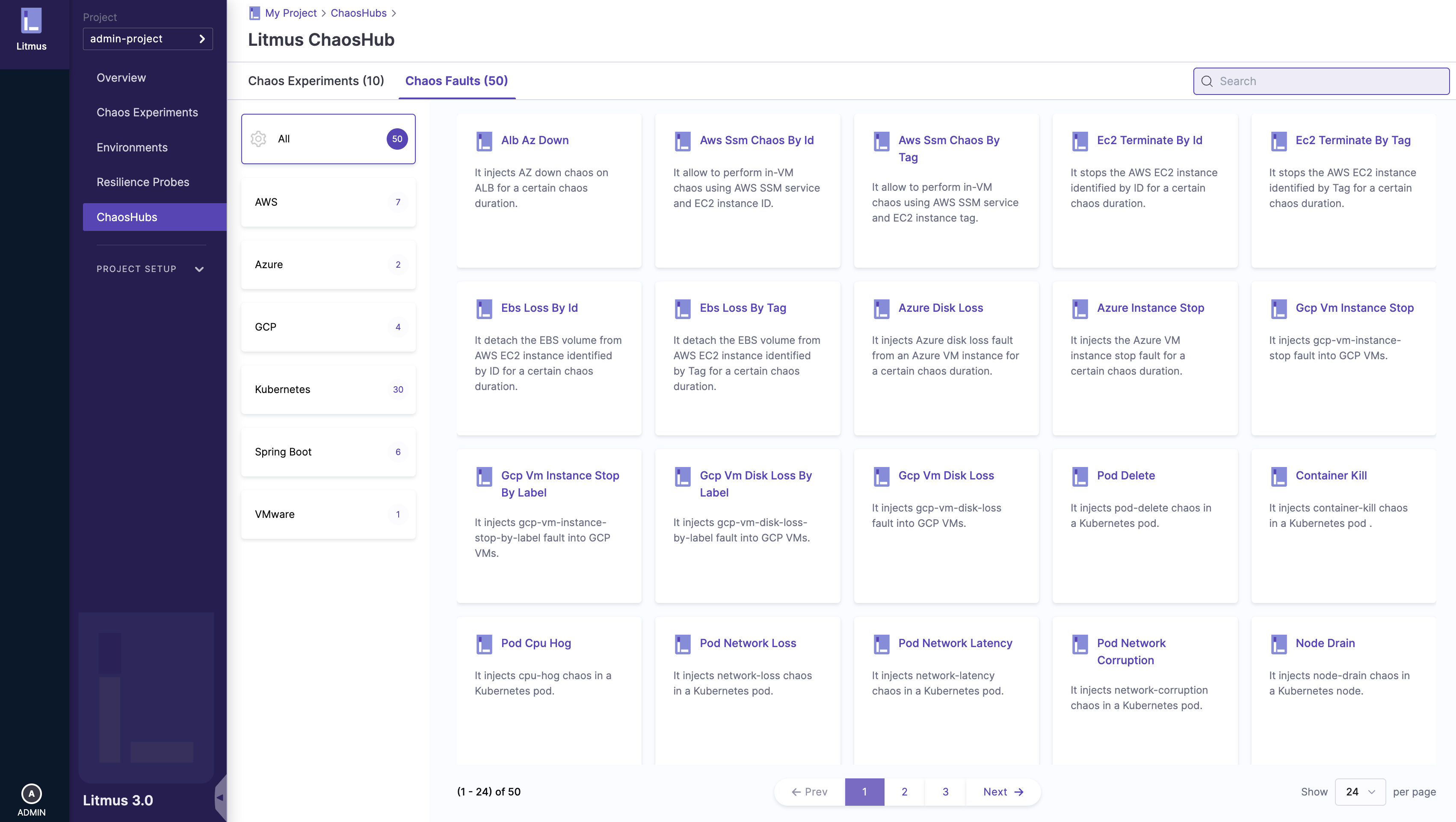 After connecting a ChaosHub, you can view the different pre-defined chaos experiments present in the ChaosHub.