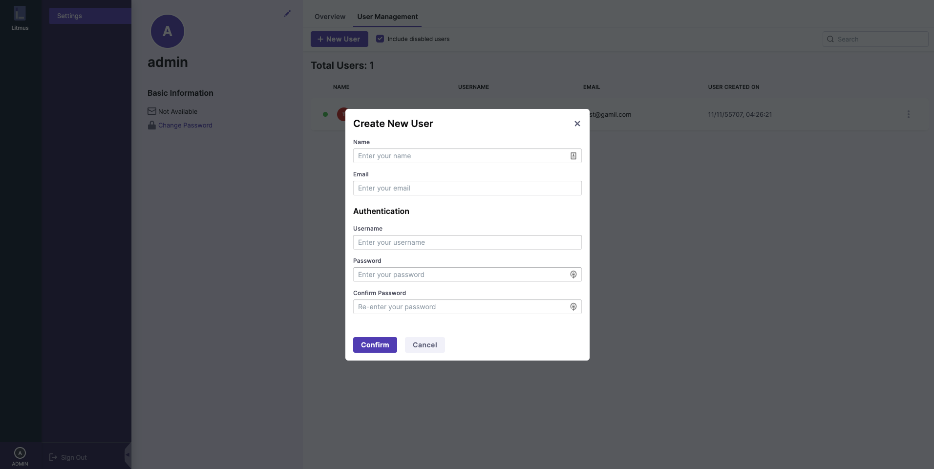 This feature enables the admin user to create a new user by assigning a unique username and password for that user. In addition to this, the admin user can also provide the name and email address of the new user, which is optional.